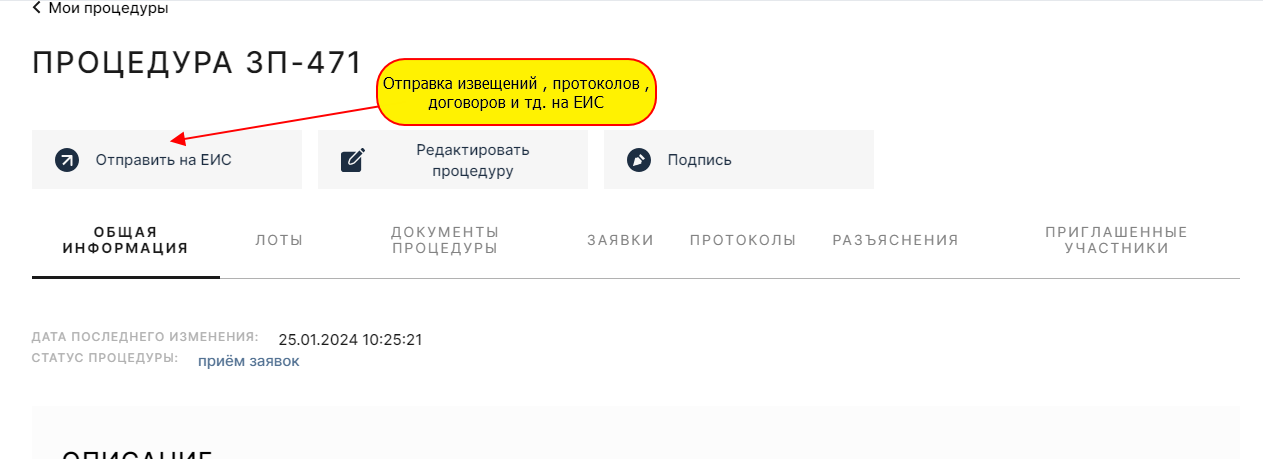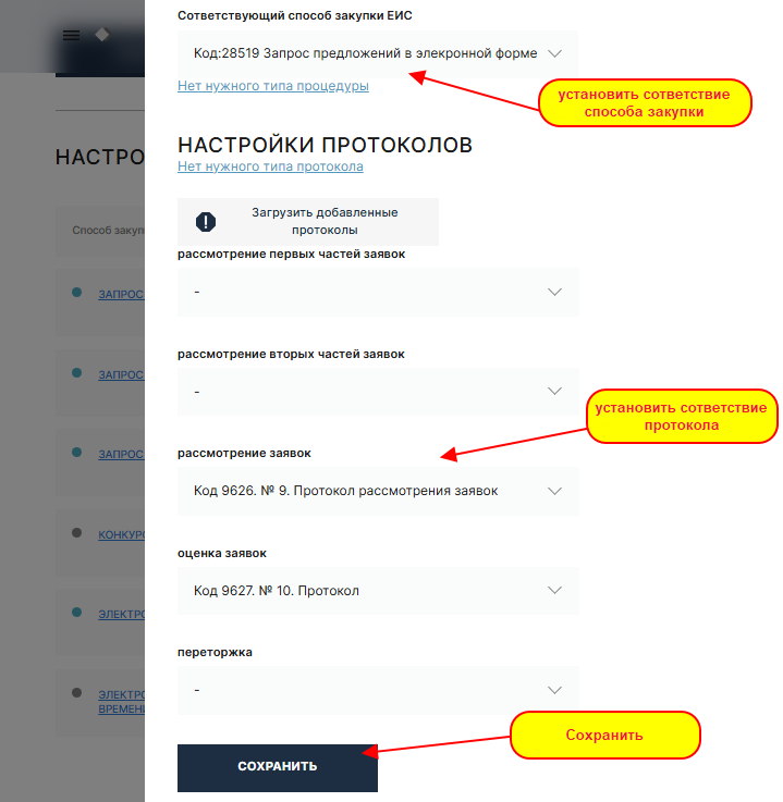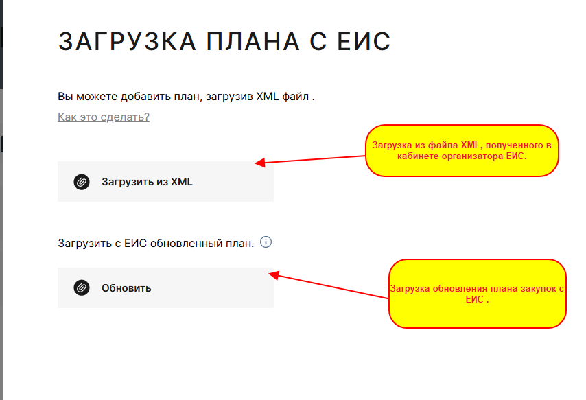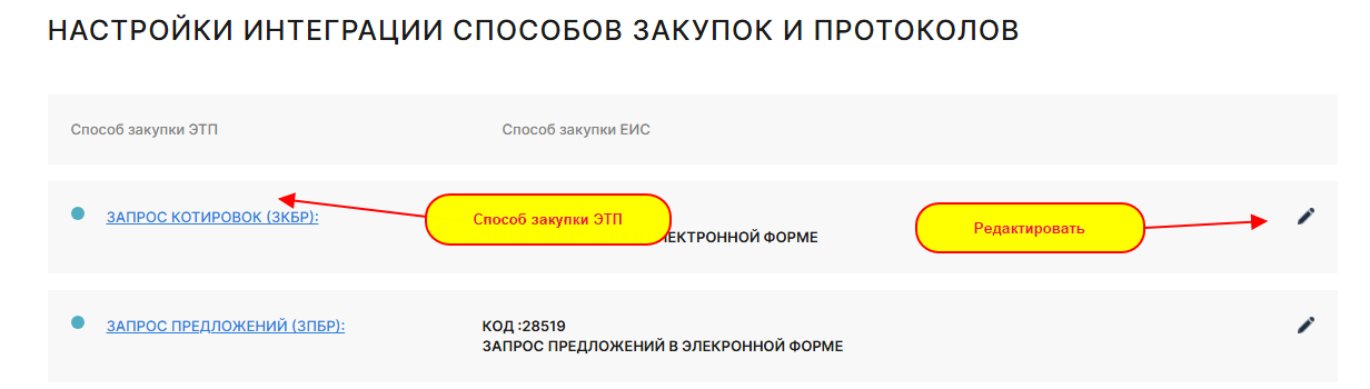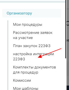 1. Получение квалифицированной ЭП Обратитесь в любой из аккредитованных при Минкомсвязи РФ Удостоверяющих Центров. Полный перечень УЦ доступен по ссылке. 2. Настройка рабочего места - Подготовьте свой ПК для работы на электронной торговой площадке по Инструкции (ссылка). - В Единой Информационной Системе (ЕИС) также представлена инструкция по настройка рабочего места (ссылка). 3. Регистрация на электронной торговой площадке - Обращаем Ваше внимание, что при регистрации организации обязательно необходимо указать "Закупки по ФЗ-223". Только в этом случае у Вас появится возможность размещать торговые процедуры в соответствии с ФЗ 223. 4. Регистрация на Общероссийском Официальном Сайте размещения заказа (ЕИС) zakupki.gov.ru - Инструкция (ссылка) 5. Первичная настройка ЕИС - Формирование справочника типа торгов. На нашей торговой площадке проводятся только торги в электронной форме. Поэтому интеграция с ЕИС происходит только по электронным типам торгов. При добавлении способов закупок на ЕИС , которые вы собираетесь проводить на нашем портале, не забывается указывать "Способ закупки в электронной форме"; - Формирование справочника типа протоколов. Один тип протокола может быть использован для нескольких способов закупок; - Размещение положения о закупках на ЕИС; - Настройка прав доступа пользователя; - Настройка интеграции с внешней системой (торговой площадкой). Все вышеуказанные действия доступно описаны в инструкции на ЕИС(ссылка) 6. Выполнить все необходимые настройки в личном кабинете ЕИС 6.1 Настройка интеграции с торговой площадкой : В меню слева выбрать раздел Настройки интеграции на открывшейся странице ввести данные : Логин и Пароль для обмена данными с торговой площадкой после этого нажать Добавить позицию в таблицу : Эти же Логин и Пароль нужно будет указать на торговой площадке в разделе Настройки интеграции с ЕИС: Далее отметить те данные которые будет получать ЕИС с торговой площадки : В конце настройки обязательно нажать Изменить настройки для сохранения всех введенных настроек. 7. Настройка интеграции с ЕИС в личном кабинете торговой площадки ВАЖНО!!! Выполнять настройки интеграции на портале возможны только на следующий день после настройки способов закупок и протоколов на ЕИС, так как выгрузка информации с ЕИС производится в 3:00 по московскому времени. - В личном кабинете в меню слева откройте "Организатору- Настройка интеграции 223ФЗ"; - Каждому способу размещения торговой процедуры на торговой площадке поставьте в соответствие способ, зарегистрированный Вами на ЕИС; - настроить соответствия между протоколами на торговой площадке и на ЕИС; сохраните настройки, нажав "Сохранить"; - В настройке типов процедур выбрать типы процедур, указанные Вами на http://zakupki.gov.ru. - В настройке протоколов выбрать типы протоколов, указанные Вами на http://zakupki.gov.ru. В конце настройки нажмите кнопку Сохранить. 8. Получение и загрузка файла с Планом закупок . На ЕИС в разделе Планы закупок открываем актуальный план на просмотр кнопкой Печатная форма : Скачиваем xml файл плана закупок : Переходим на Торговую площадку , в разделе План закупок нажимаем кнопку Загрузить с ЕИС , далее Загрузить из Файла выбираем файл и дожидаемся сообщения об успешной загрузке: Так же можно загрузить обновленный план закупок с ЕИС, если есть предыдущая версия плана уже загруже