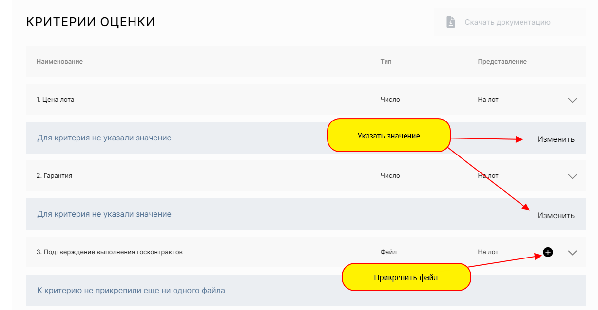 2.5.1. Конкурс, запрос предложений.  В разделе «Критерии оценки» по каждому критерию указать предложение в запрашиваемом Организатором процедуры формате. Для этого напротив критерия нажать на . Появится строка, в которой отобразится активная надпись для подачи предложения по критерию «Укажите значение». Необходимо нажать на активную надпись. В открывшейся форме указать предложение по критерию. Необходимо указать предложения по всем критериям.
