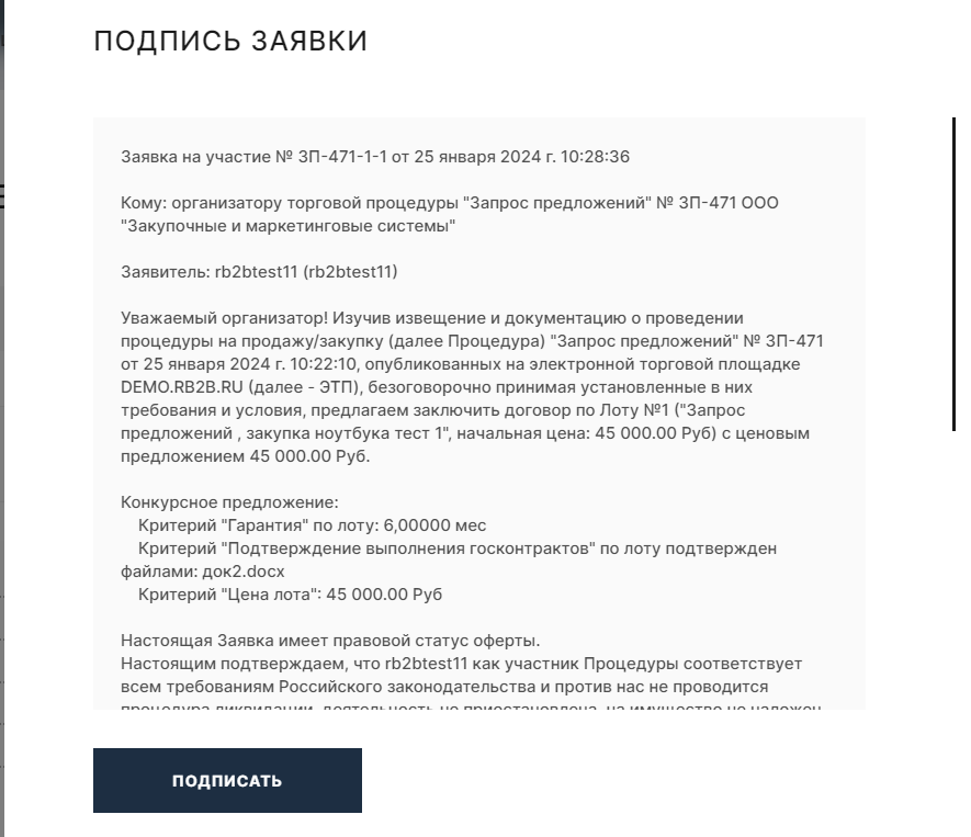 2.6.2.    Если для участия в процедуре предусмотрено применение ЭП, то в правом нижнем углу необходимо нажать кнопку «Подписать заявку». Вам необходимо ознакомится с автоматически сформированной заявкой на участие, а затем нажать на «подписать».