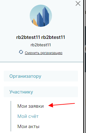 2.3.    После этого Заявка на участие в закупке отразится в перечне заявок пользователя ЭТП, левое выпадающее меню , Участнику - Мои заявки.