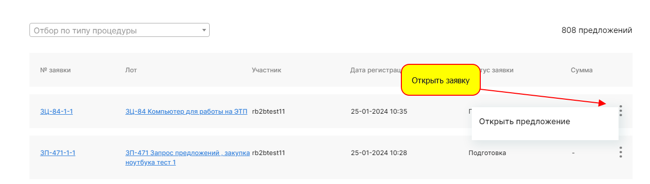 2.   Подача заявки пользователем ЭТП для участия в процедуре.