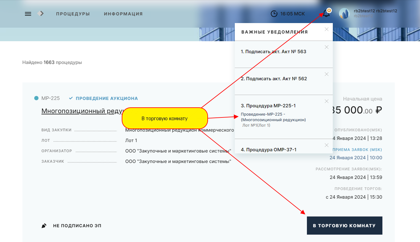 4.1.1.    Допущенный к участию в процедуре пользователь в личном кабинете увидит уведомления о статусе процедуры «Проведения аукциона» и приглашение пройти в торговую комнату. Нажав на одну из этих надписей пользователь попадает в торговую комнату лота процедуры.