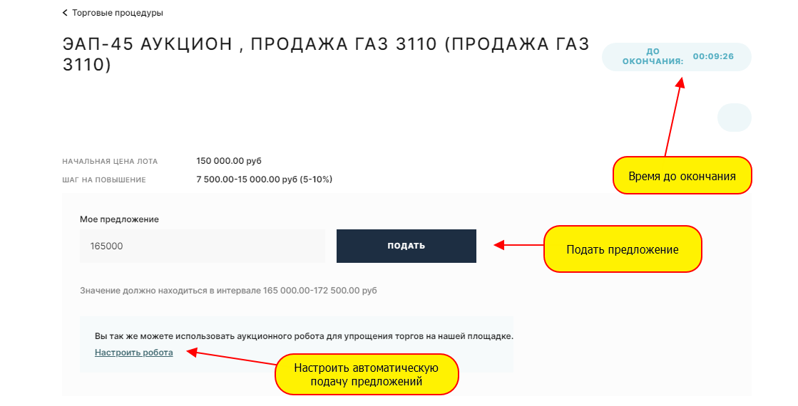 Участник процедуры может подавать ценовые предложения в режиме реального времени по процедурам: Аукцион, Многопозиционный редукцион.  По иным способам проведения процедур участники подают свои предложения при подачи заявки на участие в процедуре.