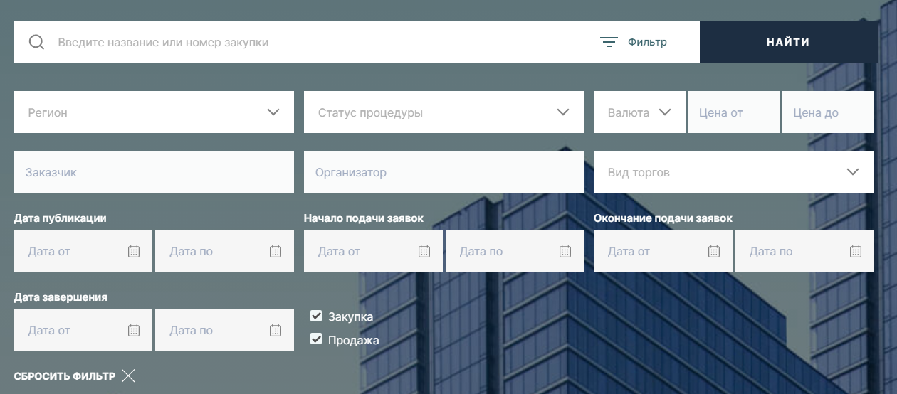 На ЭТП предусмотрен поиск процедур по нескольким признакам. Для этого необходимо нажать на «Расширенный поиск».  Заполнить необходимые критерии и признаки искомых процедур. Нажать на кнопку «Найти».