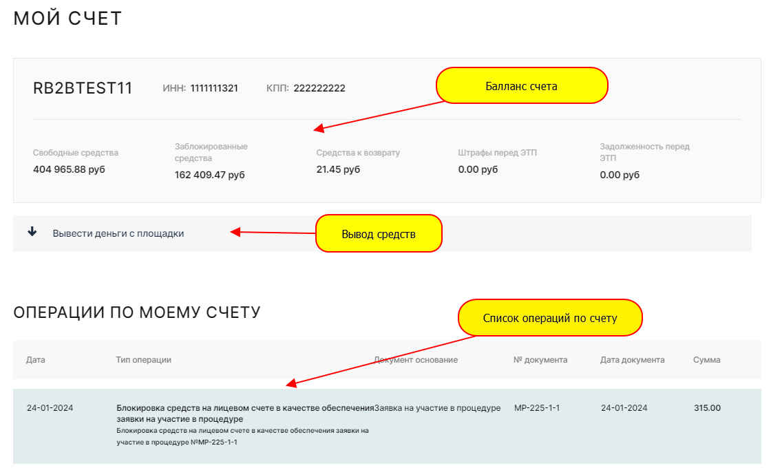 6.1.    Денежные средства, перечисленные на расчетный счет ЭТП участниками процедур закупки/продажи отобразятся в течение 2 (Двух) рабочих дней с момента поступления их на расчетный счет ЭТП в строке «Свободные средства» в окне пункта меню «Мой счет».