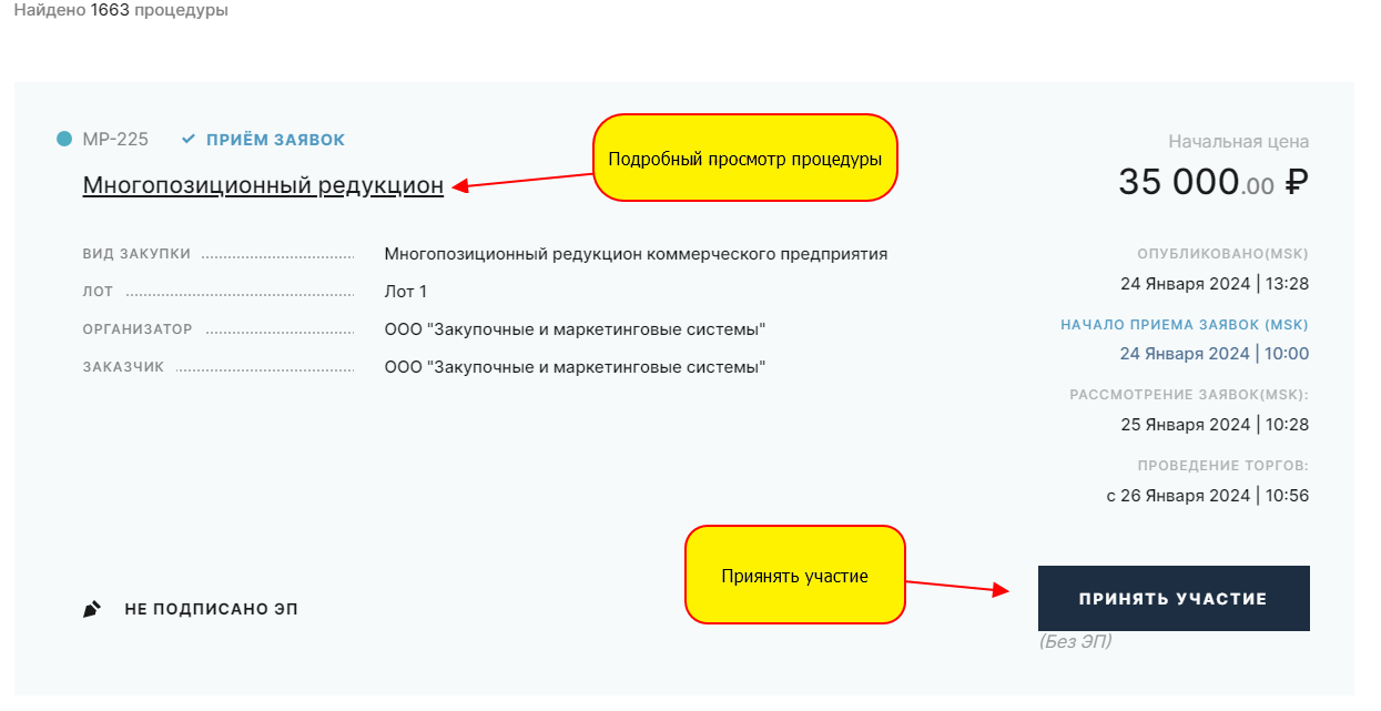 2.2.    Для подачи заявки на участие в процедуре необходимо в окне процедуры нажать на «Принять участие».