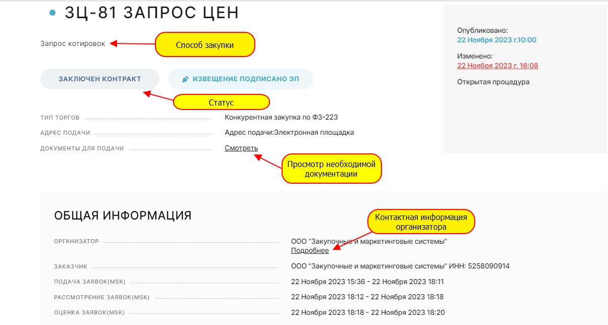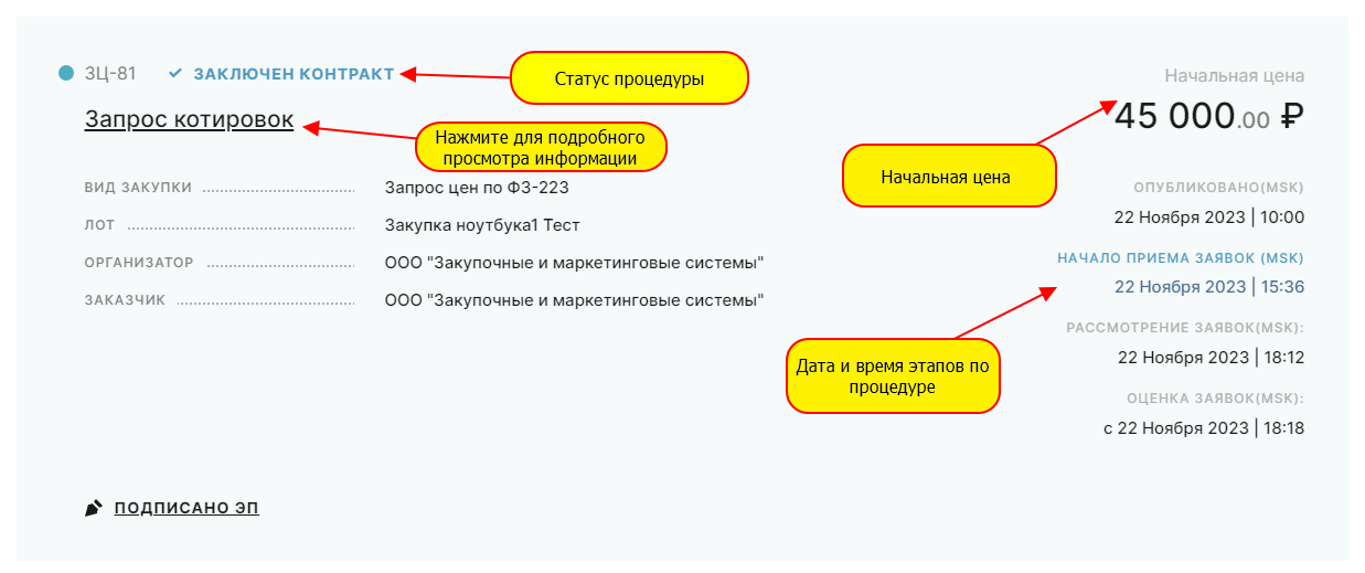 - Договоры (для ознакомления с фактом заключения договора по процедуре);