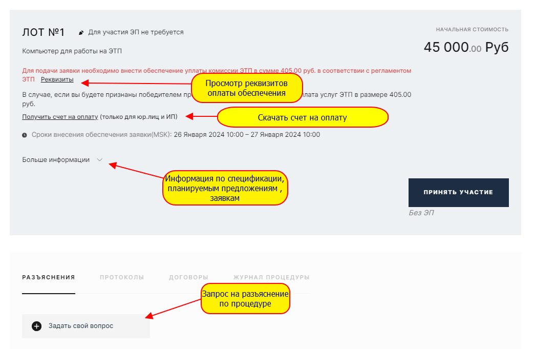 2.1.    Подать заявку на участи в процедуре может только зарегистрированный на ЭТП пользователь ЭТП в соответствии с настоящим руководством, у которого зарегистрирована организация в соответствии с настоящим руководством, чьи интересы представляет на ЭТП пользователь. Если в процедуре указано на применение ЭП для участия, пользователь ЭТП должен быть аккредитован на ЭТП в соответствии с настоящим руководством.