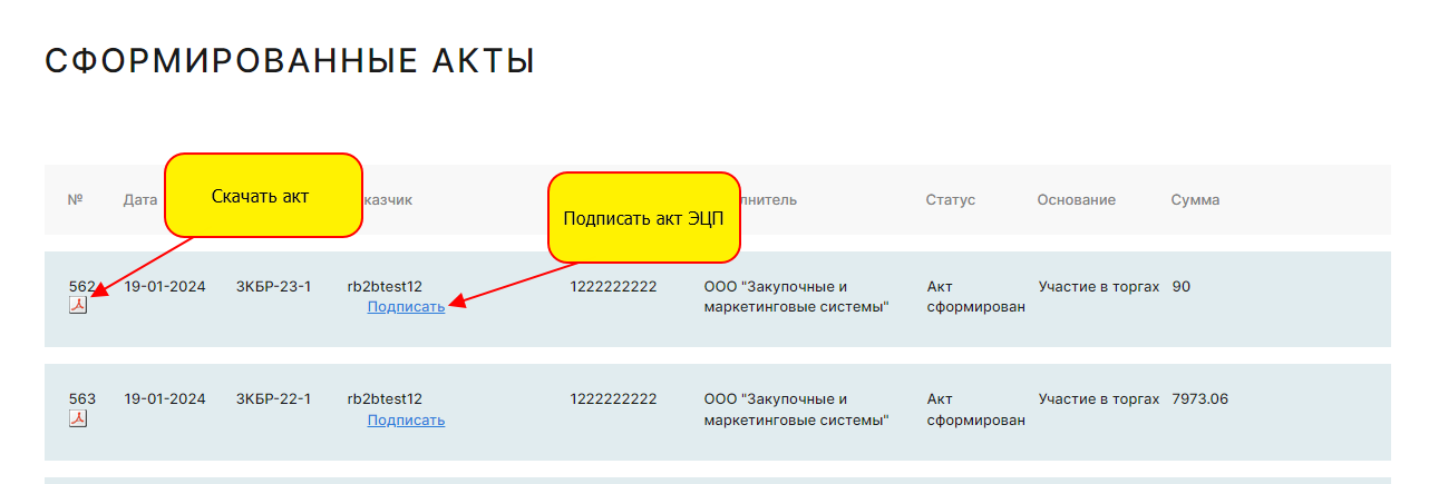 Акты на услуги площадки доступны участникам процедур через левое выпадающее меню : Участнику - Мои акты :