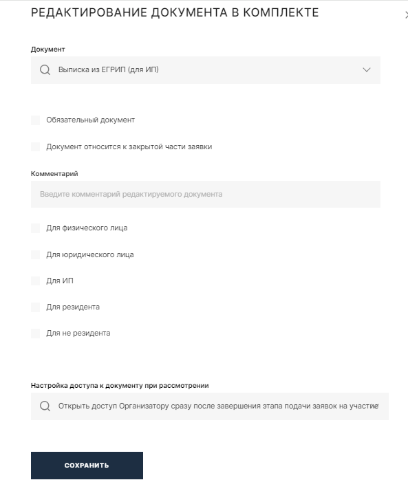 Для размещения процедуры необходимо определится с потребностью: - создания нового комплекта документов запрашиваемого у претендентов на участие в процедуре, - создания нового шаблона процедуры, - создание комиссии для принятия решения по каждому этапу процедуры закупки/продажи. 1.Комплект документов для подачи предложений участниками Для создания нового комплекта документов необходимо: Добавить новый комплект документов можно копированием существующего комплекта документов или добавлением нового комплекта: Добавление комплекта документов. Нажать на кнопку «Добавить комплект документов». В открывшейся форме «Редактировать комплект» необходимо указать код и наименование , нажать «Сохранить». В добавленной строке кнопкой разверните содержимое комплекта : По каждому выбранному документу можно редактировать дополнительные детали, а именно - предоставления документа участником, являющимся: - Юридическим лицом; - Физическим лицом; - Индивидуальным предпринимателем; - Резидентом; - Не резидентом. В случае отсутствия необходимого типа документов в перечне документов. Можно направить администратору запрос на добавление. 2. Создание шаблона процедуры . Для создания нового шаблона процедуры необходимо в меню «Организатору» выбрать раздел «Мои шаблоны процедур». В открывшемся окне нажать «Добавить новый шаблон» . В открывшемся окне необходимо заполнить все поля. По заполнению некоторых полей ниже приведены комментарии. После завершения заполнения шаблона необходимо нажать кнопку «Сохранить». 3. Добавление комиссии. Для формирования на ЭТП комиссии, принимающей решение по окончании этапов процедур закупки/ продажи необходимо : 1). в пункте меню выбрать «Организатору», затем «Комиссии». В открывшемся окне выбрать «Добавить комиссию». В открывшейся форме заполнить обязательные поля. После заполнения полей нажать кнопку «Сохранить». 2). В добавленной строке кнопкой разверните содержимое комиссии , нажмите кнопку «Добавить члена комиссии» : 3). В открывшейся форме «Редактирование состава комиссии» заполнить все обязательные поля. После заполнения нажать на кнопку «Создать». Количество членов комиссии не ограничено.