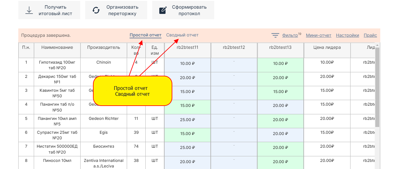 отчет (по каждой позиции: цена лидера, лидер, цена